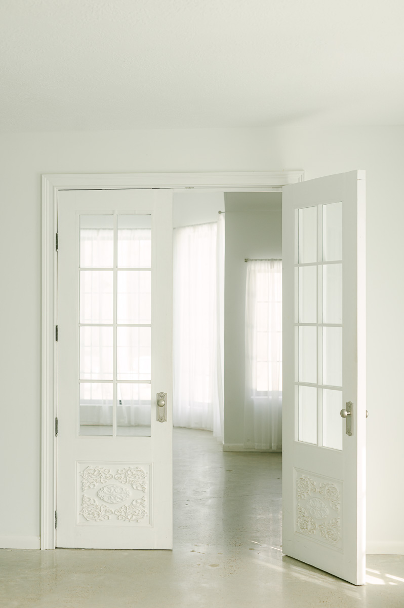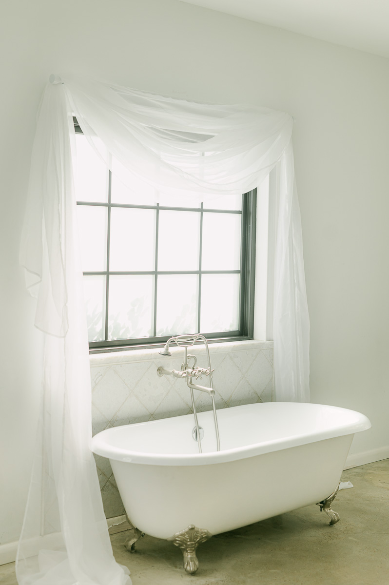The studio is a local Houston space that I will book for your session after we decide on a date. It features gorgeous natural light and soft curtains that give us both privacy and a romantic, airy feel. The white walls and concrete floors create the perfect backdrop, while the beautiful architectural details add a touch of timeless charm.